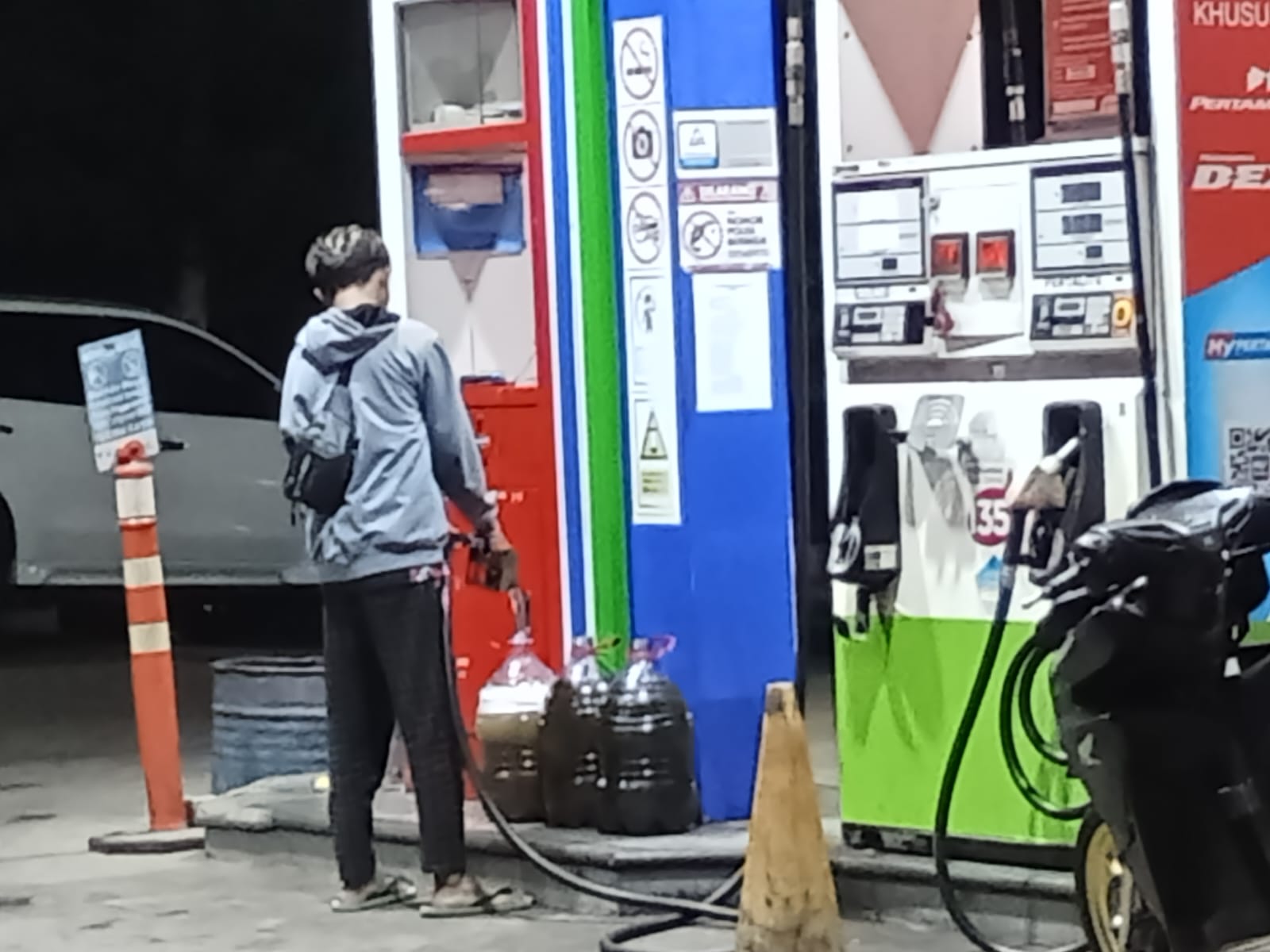 Tim awak media CyberTNI.id yang tengah melintas di lokasi, secara langsung mendapati praktik yang mengarah pada pelanggaran hukum berat: seorang pengangsu BBM terlihat melakukan pengisian (ngecor) solar ke dalam galon air mineral secara mandiri, tanpa intervensi petugas SPBU. Ironisnya, aksi ini berlangsung secara terbuka di area SPBU, dengan indikasi kuat adanya pembiaran bahkan potensi keterlibatan dari pihak pengelola SPBU.