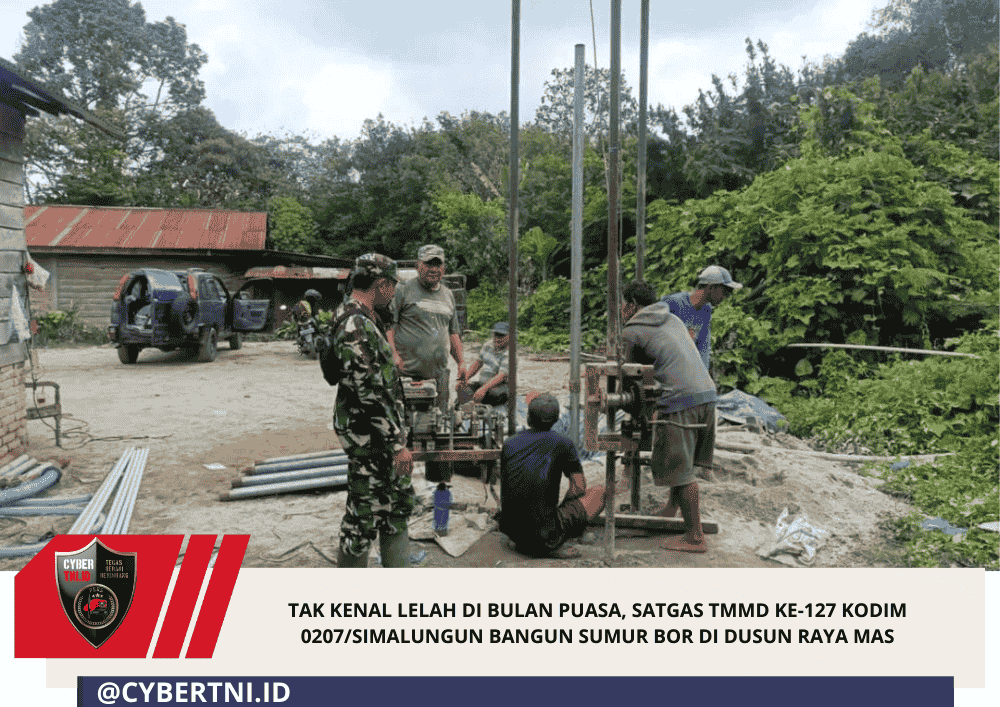 CyberTNI.id | SIMALUNGUN – Pengabdian tak pernah berhenti, meski tengah menjalankan ibadah puasa. Pada Sabtu (21/02/2026), personel Satgas TMMD ke-127 dari Kodim 0207/Simalungun tetap bersemangat melaksanakan pembuatan sumur bor bersama warga di Dusun Raya Mas, Nagori Raya Usang, Kecamatan Dolok Masagal, Kabupaten Simalungun.