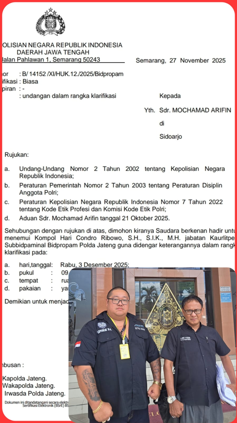 Besok Rabu 3 Desember 2025. Saya diminta oleh klien saya ( pelapor ) yaitu M. ARIFIN untuk mendampingi beliau hadir untuk diperiksa di ruang Urlitpers Subbidpaminal Bidpropam Polda Jateng pk. 09.00 Wib Pagi.