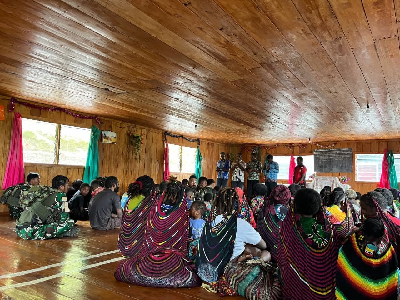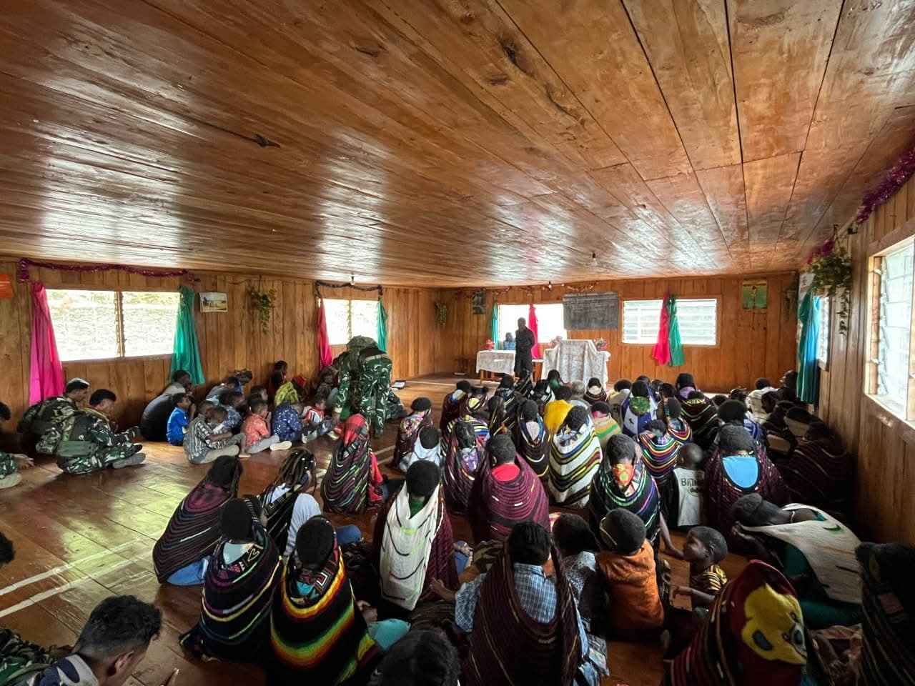 Ibadah berlangsung sederhana namun penuh kehangatan. Nyanyian pujian yang bergema dari dinding kayu gereja menyatukan hati jemaat dan prajurit, menciptakan harmoni yang indah di tengah alam Puncak Jaya yang sejuk.