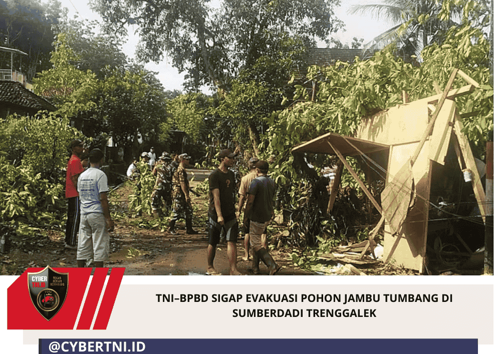 CyberTNI.id | Trenggalek – Ketentraman pagi di Desa Sumberdadi, Kecamatan Trenggalek, sontak pecah pada Minggu (18/1/2026). Sebuah pohon jambu besar tumbang tanpa peringatan di RT 05 RW 03 Dusun Krajan, menimpa warung nasi pecel milik Bapak Yani dan garasi rumah Bapak Giman, serta melumpuhkan sementara jalan utama desa.
