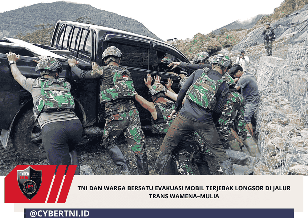 CyberTNI.id |Puncak Jaya — Hujan deras yang mengguyur wilayah Kampung Kalome memicu longsor dan menutup sebagian akses Jalan Trans Wamena–Ilu–Mulia, Sabtu (21/2/2025). Sebuah mobil milik warga sempat terjebak material tanah dan bebatuan, sebelum akhirnya berhasil dievakuasi berkat kerja sama Satgas dan masyarakat setempat.