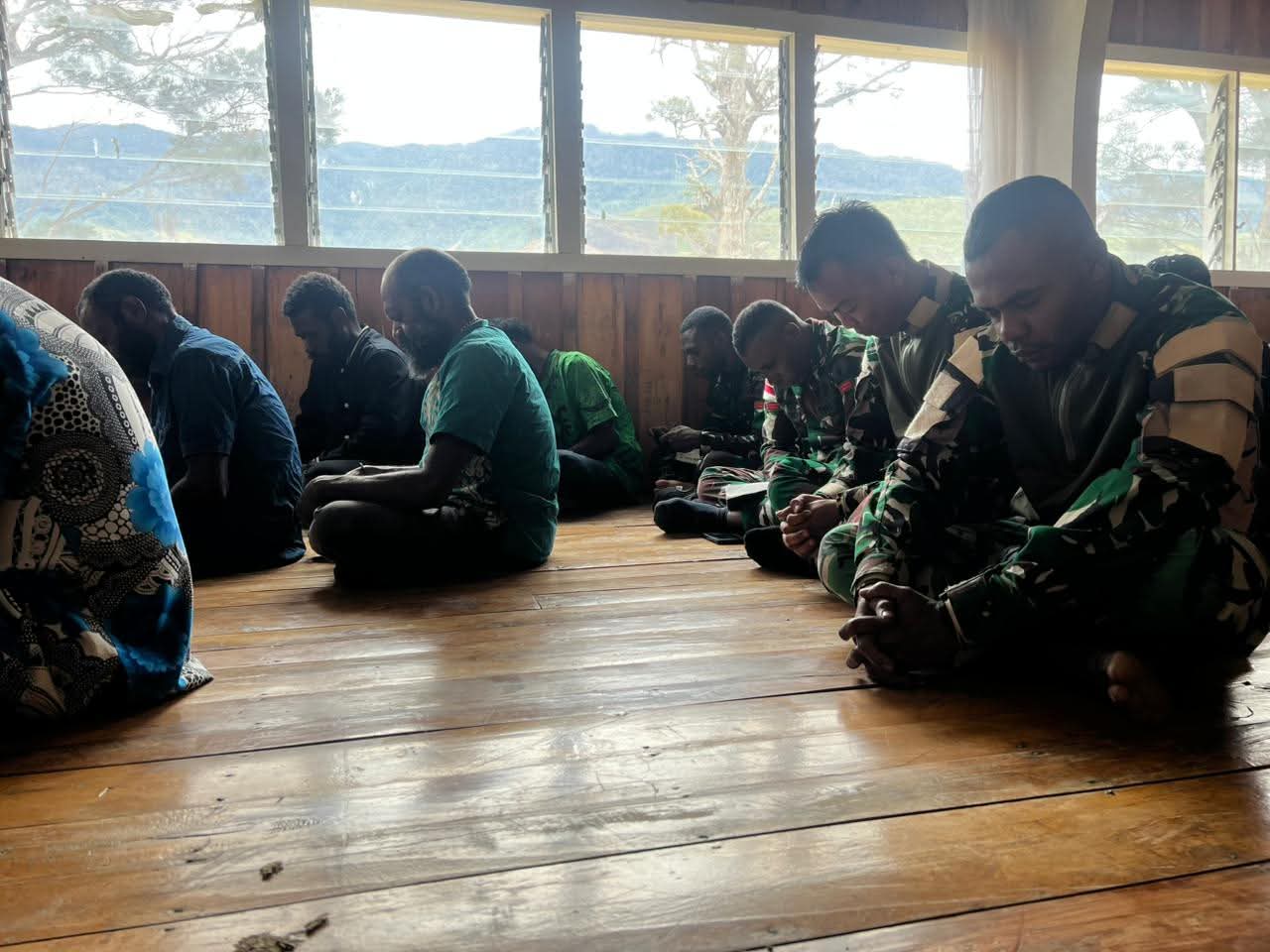 Ibadah dipimpin oleh Gembala Lebanus (48) yang berdiri di depan jemaat dengan suara bergetar menahan haru. Di hadapannya, deretan prajurit TNI berloreng duduk khusyuk, menundukkan kepala dalam doa bersama warga.