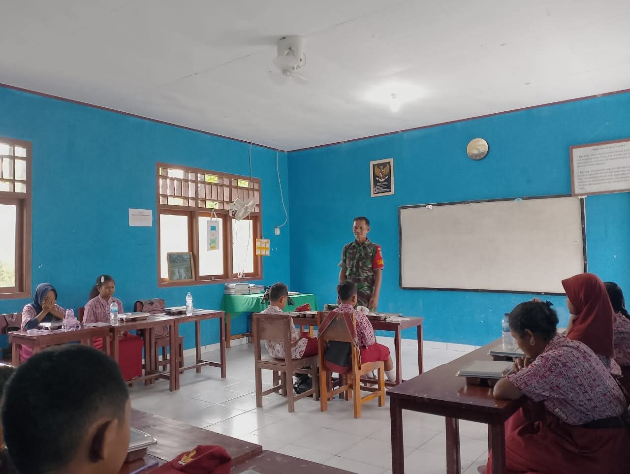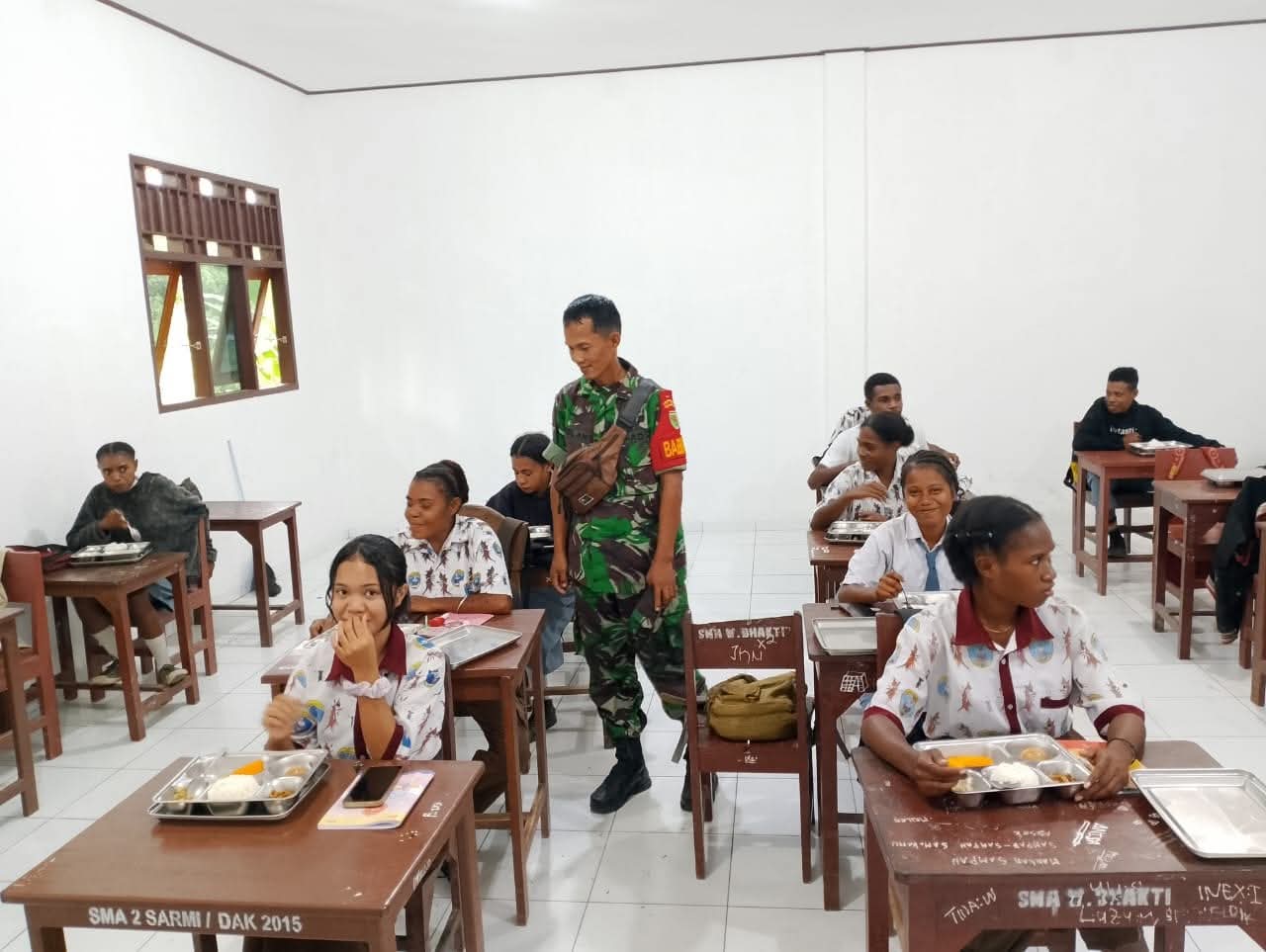 CyberTNI.id | Kabupaten Sarmi, Rabu 8 Oktober 2025 — Dalam upaya mendukung program pemerintah meningkatkan gizi anak sekolah, Babinsa Koramil 1712-06/Bonggo aktif melakukan monitoring program Makan Bergizi Gratis (MBG) di sejumlah sekolah di Distrik Bonggo, Kabupaten Sarmi, Rabu (8/10/2025).