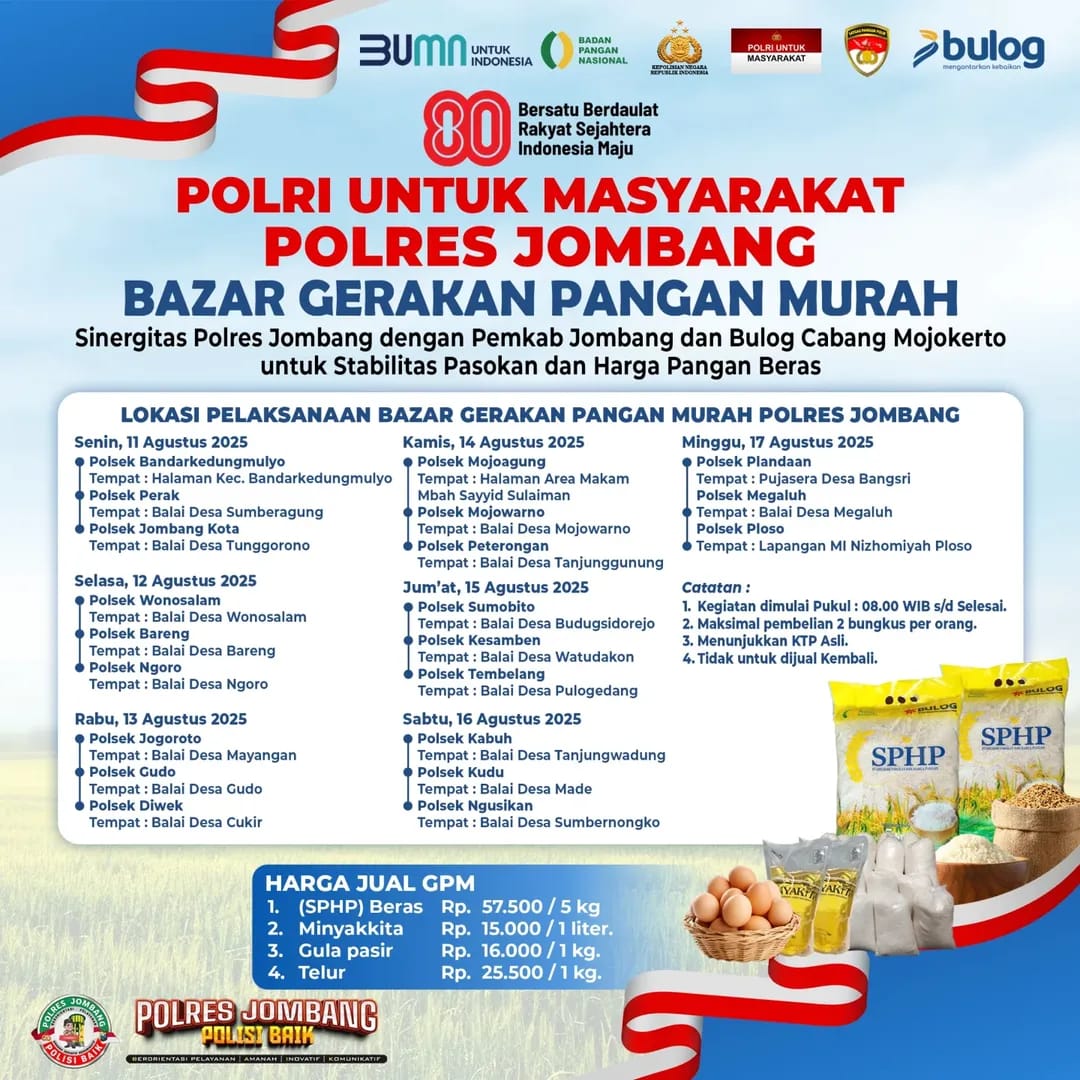 “Bazar murah ini adalah wujud nyata sinergi Polri, Pemkab, dan Bulog dalam membantu masyarakat. Kami ingin memastikan bahan pangan pokok dapat diakses dengan mudah dan terjangkau oleh warga Jombang, terutama menjelang peringatan Hari Kemerdekaan Republik Indonesia,” jelas AKP Kasnasin.