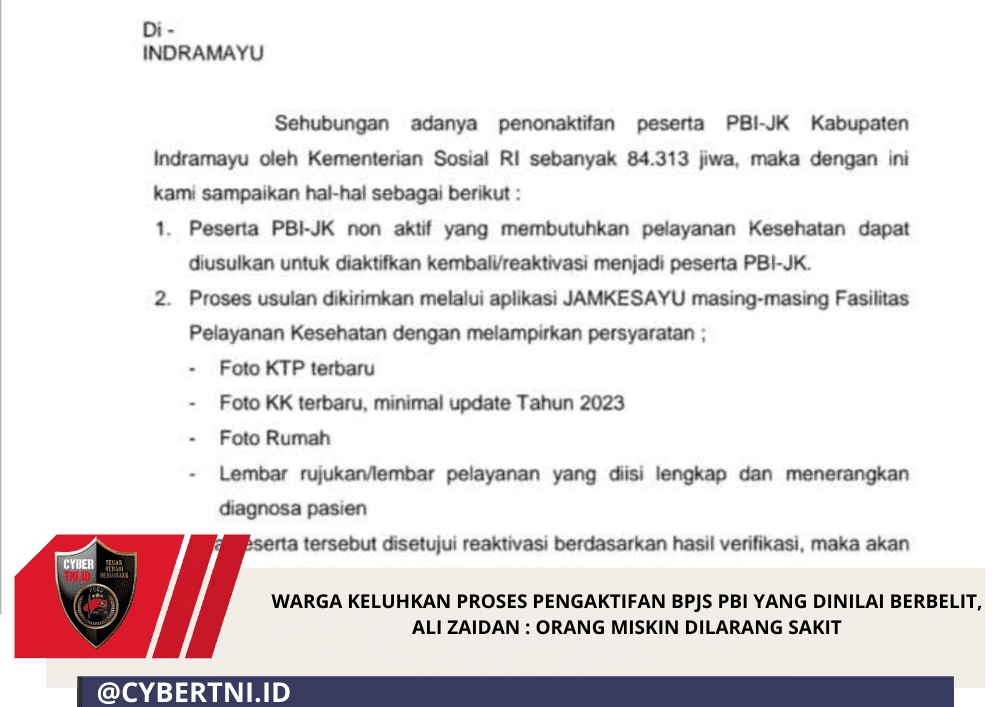 CyberTNI.id| INDRAMAYU, Selasa 17 Februari 2026 — Sejumlah elemen masyarakat mengeluhkan proses pengaktifan kartu BPJS PBI JKN (Penerima Bantuan Iuran Jaminan Kesehatan Nasional) yang dinilai berbelit dan menyusahkan warga miskin kota mangga.
