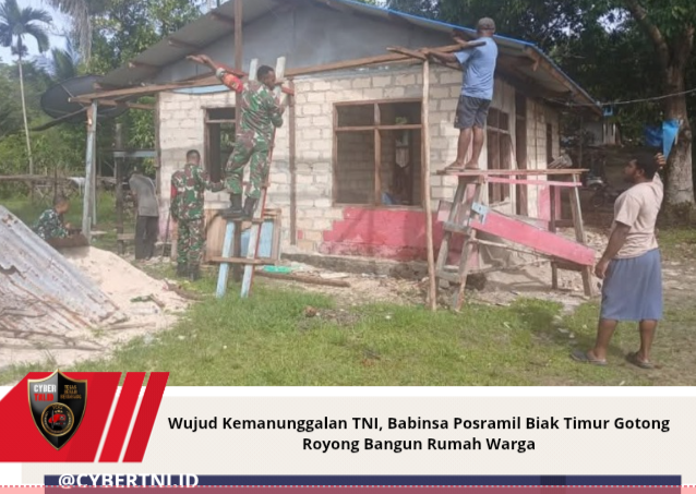 CyberTNI.id | Biak – Sebagai bentuk nyata kepedulian dan kemanunggalan TNI dengan rakyat, personel Babinsa Koramil 1708-01/Biak Kota melalui Posramil 01 Biak Timur melaksanakan kegiatan karya bakti membantu pembangunan rumah salah satu warga di Kampung Yenusi, Distrik Biak Timur, Kabupaten Biak Numfor, Rabu (7/1/2026).