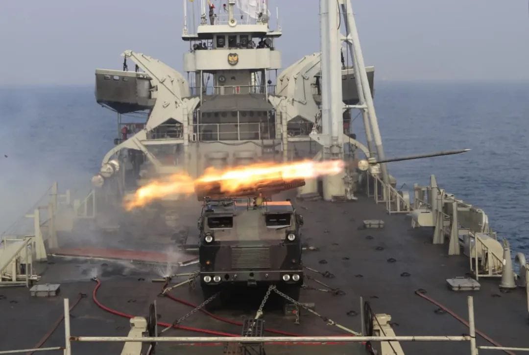 Pasmar 1. Dalam rangka Presidential Inspection untuk peringatanHUT TNI ke-80, Kendaraan Tempur (Ranpur) milik Batalyon Roket 1 Marinir (Yonroket 1 Mar) kembali melaksanakan penembakan dari atas geladak KRI Amboina 503 di Teluk Jakarta, Minggu (28/09/2025).